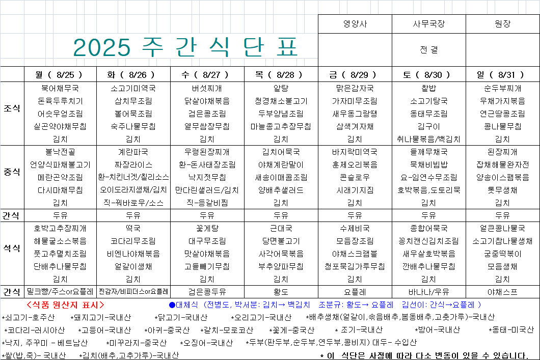 2025년 주간식단표 (9/1 ~ 9/7 )