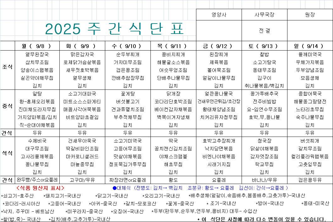 2025년 주간식단표 (9/8 ~ 9/14 )