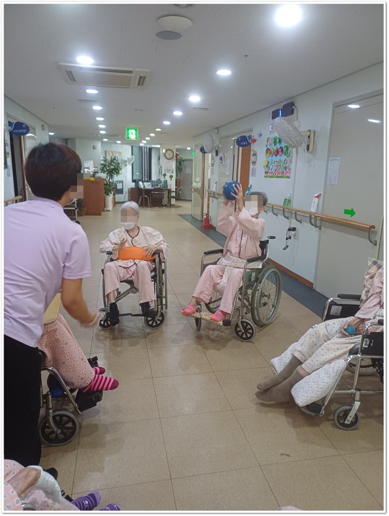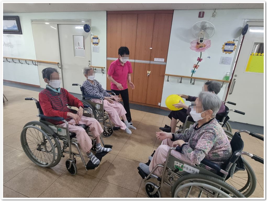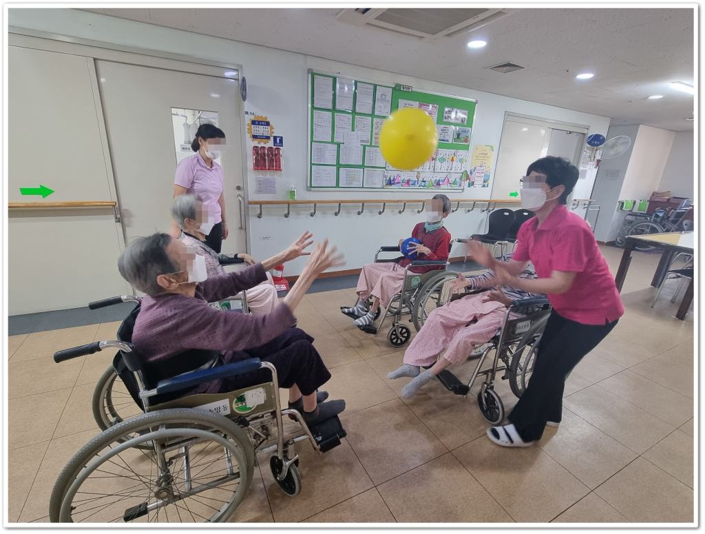공을 스스로 또는 도움을 받아 던질 수 있도록 합니다. 활동을 통해 어르신들께서 자연스럽게 몸을 움직여 활동에 참여하여 신체잔존 기능을 유지할 수 있다. 신체활동을 통해 뇌를 자극하고 근육의 둔화를 지연시키며 공을 잡고 던지는 활동을 통해 신체의 잔존기능을 유지하고 감각을 자극합니다.