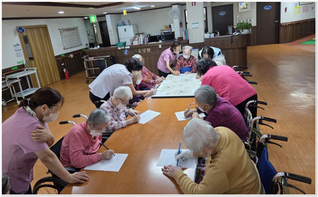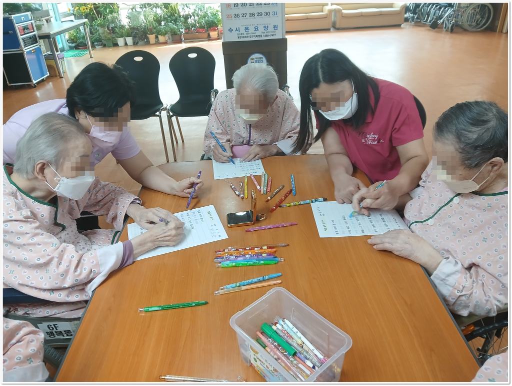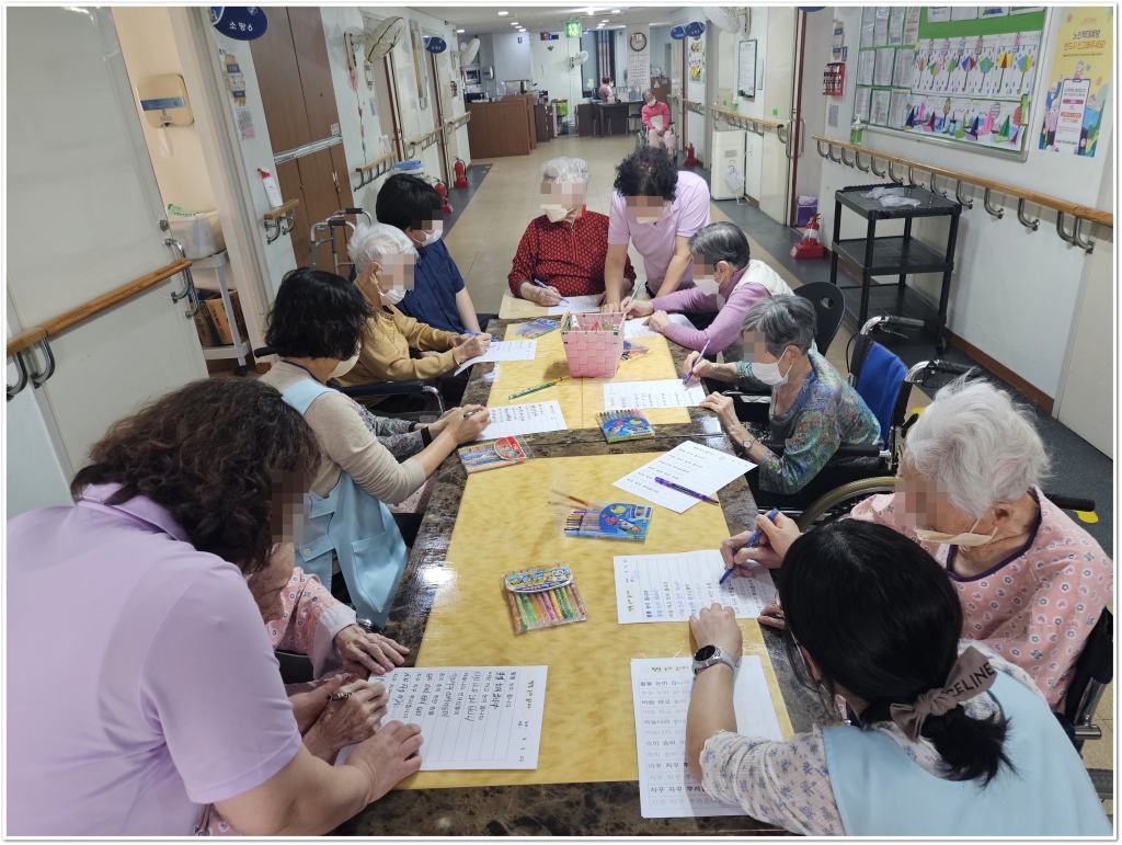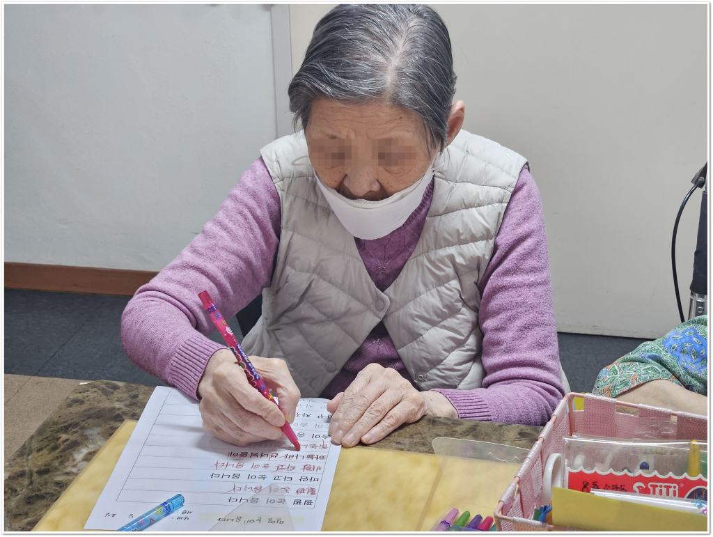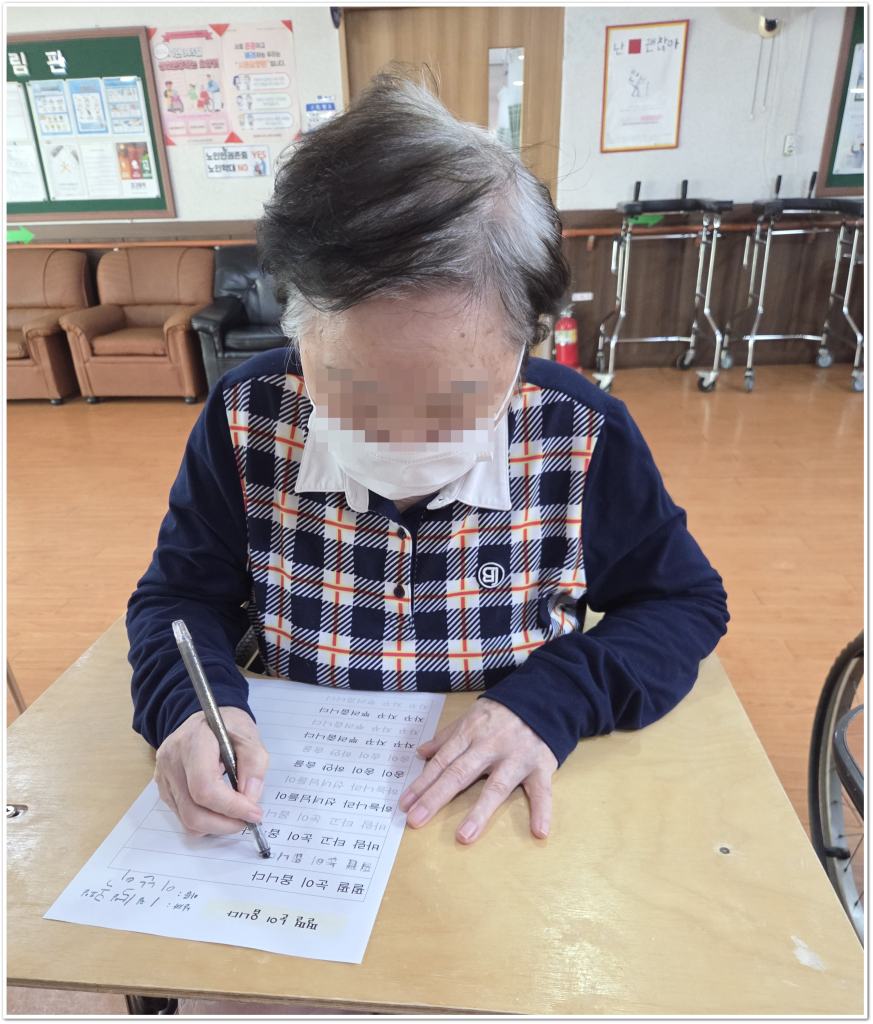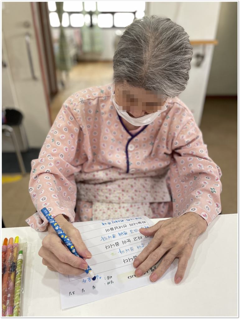 시, 동요 등의 가사 또는 단어를 써보며 기억력과 집중력을 향상시키고, 쓰기활동을 통해 인지를 자극하고 소근육 운동에 도움을 주며, 익숙한 노랫말이나 단어를 쓰는 활동을 통해 정서적 안정과 즐거움을 제공합니다.