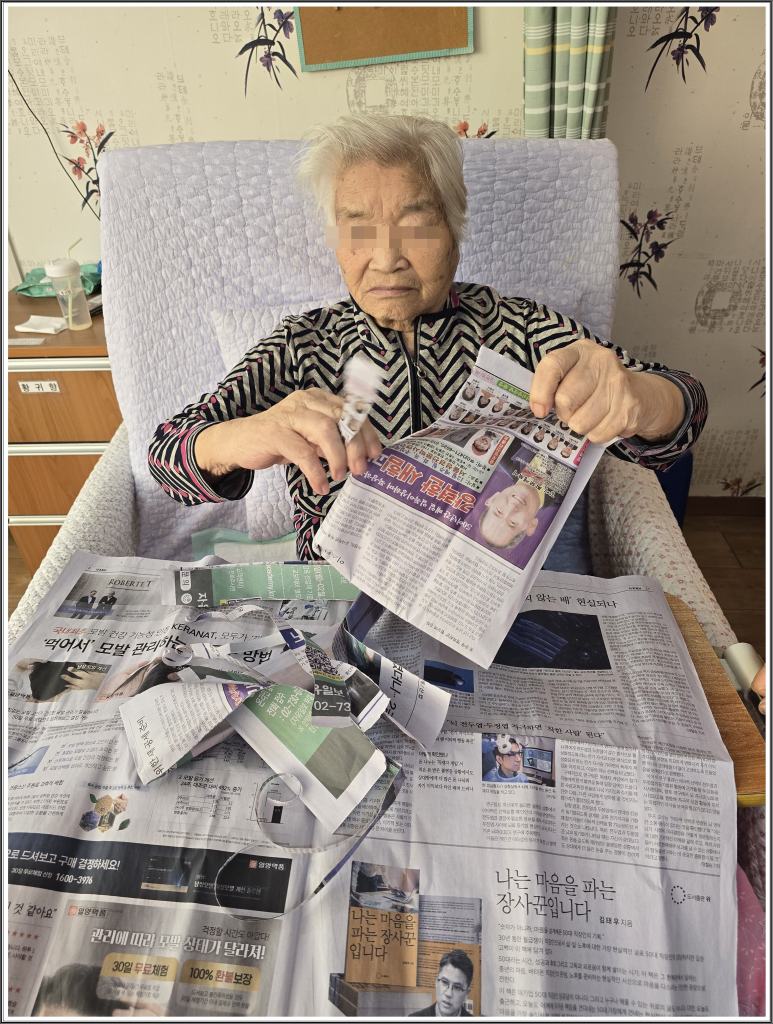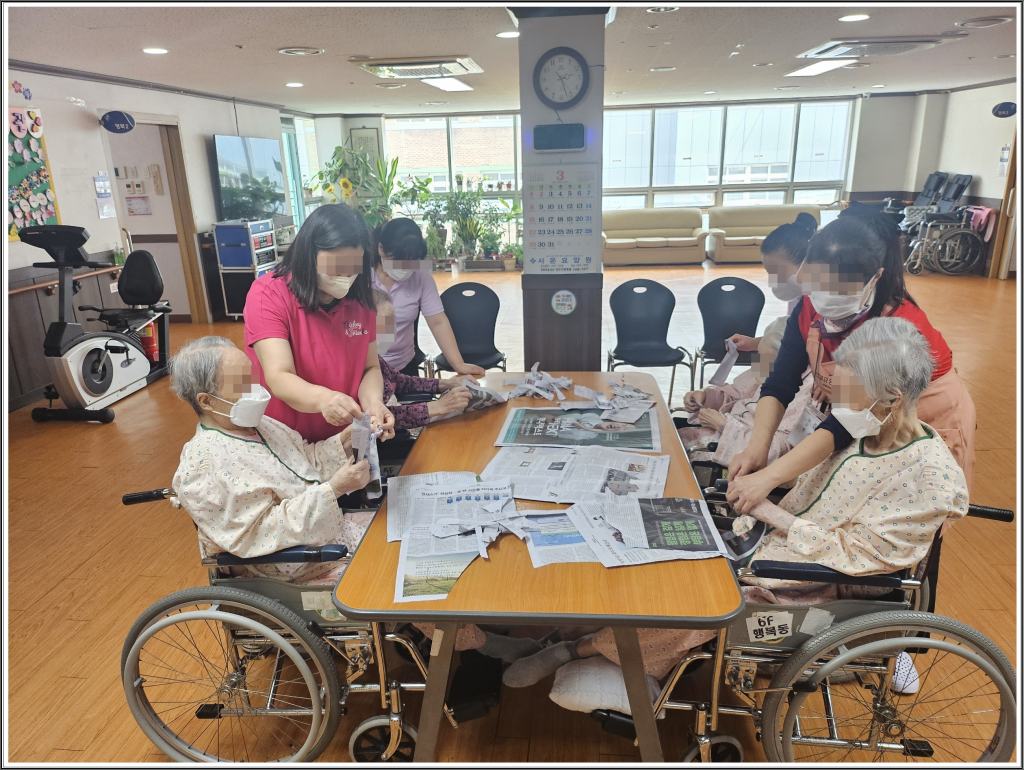 신문을 찢는 손 근육의 사용을 통해 소근육 및 신체기능을 유지할 수 있도록 하고, 신문지를 찢으며 감각자극 및 스트레스를 완화할 수 있고, 단순 반복 활동을 통해 집중력 향상 및 정서적 안정에 도움을 줄 수 있습니다.